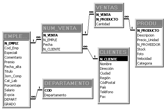 Las relaciones 1-n se representan de forma muy parecida a como se ha explicado para las relaciones 1-1. La diferencia está en que ahora no es indiferente donde se coloque la clave ajena, esta debe estar obligatoriamente en la tabla del 'mucho' (n); y además, para este caso si se permitirá que haya valores repetidos